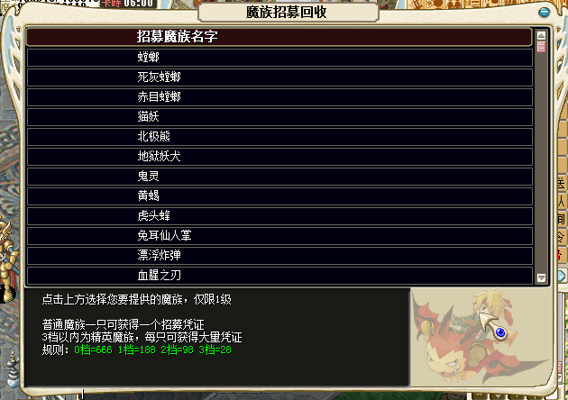 只要在列表内开放的魔族,均可提交。 将一级的对应宠物带在身上,然后点击对应的魔族名字,提交即可 3档以内(含3档)的精英魔族会额外获得大量招募证: 规则如下: 满档:招募证666个 1档:招募证188个 2档:招募证98个 3档:招募证28个 3档以外:均为招募证1个 |